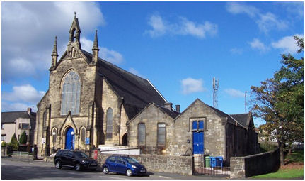 1877: The minister of Denny Parish Church attempted to create Bonnybridge into a quad sacra parish due to the increase in population and its distance from Denny.   He failed, but George Ure of Wheatlands initiated a building fund and his company offered the site at the corner of Dunure Street and High Street.  This was accepted and building begun.   However, the stone gable was blown down in winter storms only to be restored by May by the masons Howie and Dalziel of Denny.   The architect was A Watt, Renfield Street, Glasgow.  It was opened on 11th November 1877.