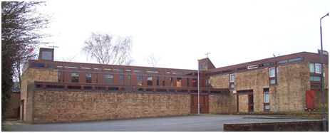 1960-61: New church on Glasgow Road built according to designs by Jack Coia. Andrew Macmillan was the project architect responsible for the detailed designs. It has yellow firebrick (cream & pink colours) facings, banded outside and panel patterned inside, with a flat copper roof. The church is rectangular with a low aisle to the west. The north end has a deep wooden band at the eaves, with a simple cross, L-shaped glazed panel lighting and aisles.