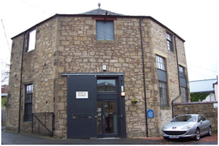 1806: The Tattie Kirk erected just off the Cow Wynd. The origin of the name is questionable. One version states that it is because the church was erected in a potato field, another that the congregation sold potatoes to raise the necessary money, and a third that the church looked tattie. The last can be easily dismissed. Its hexagonal plan soon earned the church another rural nickname _ the “threshing mill”. It measures 46ft across internally, and the masonry is of rubble with dressed quoins and margins. The slated roof rises to an urn finial. There are two ranges of windows of which the upper lights a gallery. On the north side of the building entrance doorways give access both to the ground floor and to the gallery, the latter being approached by an external stone stair. On the south-east side of the church a doorway, which is now blocked, may originally have given access to the pulpit. In the original arrangement the pulpit probably stood against the south wall, while a gallery, supported on moulded wooden columns, ran round the rest of the building. The church is said to have had a seating capacity of 580. The interior is now much altered and after some years as a tool store and workshop for Sime’s the Tool Merchants it is now a boutique with an office above. The cost of erection is put at £850.
