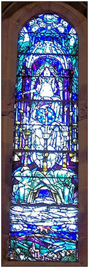 An original fixture from 1900, is the silvered-bronze font by Albert Hemstock Hodge (1875-1918), a native of Islay. The pipe organ, by James Jepson Binns of the Bramley Organ Works, Leeds, was installed in 1902 and the communion table/war memorial (also designed by the architect J J Burnet, with figures by William Vickers) was dedicated in 1921. The electric lighting scheme came courtesy of Burnet, Son & Dick, in 1927; the fleur-de-lys on top of the light fittings in the nave and south aisle, echoing that on the wall-covering in the Chancel, which may also date from that time.