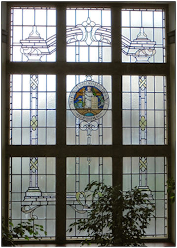 The main staircase of the Denny Town House has a stained glass window featuring the Burgh Seal. This was an original feature of the 1932 building.