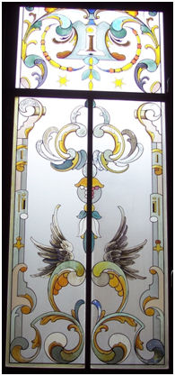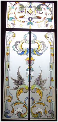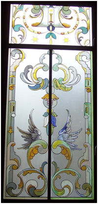 Five painted glass windows on the Lint Riggs façade having geometric floral designs in the lower main panels and masonic emblems symbolising office bearers in their smaller upper panels. They are original features of the 1906 scheme; each represents a Principal Office Bearer namely – The Right Worshipful Master in the centre flanked on either side by the Worshipful Senior and Junior Wardens. The two Wardens are flanked on their other side by windows representing the Senior and Junior Deacons.