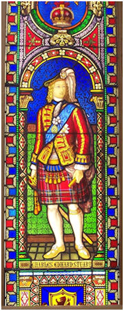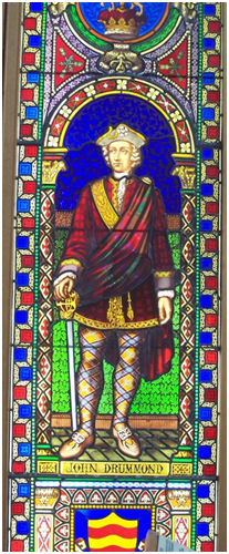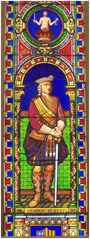 Lord John Drummond, who commanded the left wing of the Jacobite forces, is depicted on the right light of the window.  The inscription beneath his portrait is as follows: “Drummond, they valour, loyalty and zeal were all devoted to thy Prince’s weal.  Perth’s gallant hosts dispersed the Stuart’s foes, and Stuart’s standard o’er Bantaskine rose.”