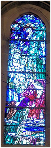 (2) In the small window on the north side of the chancel next to the east gable is a representation of the end of the walk to Emmaus, and shows Christ breaking bread with the two disciples (St Luke 24, verses 13-31), subscribed by the words, “their eyes were opened and they knew Him.” They sit at a wooden table covered by a cloth with a flagon and glasses on it. Below is a medallion showing Cleophas and his companions inviting Jesus to enter the house. The whole is surrounded by the monochrome signs of the four evangelists and surmounted by the dove of peace.