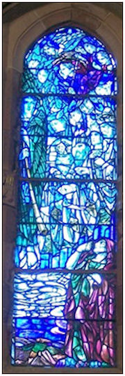 (1) The east window consists of three lights and bears the signature of Douglas Strachan. It is in a modern style with blue as the predominant colour and is a representation of St John’s vision in the 4th and 5th chapters of the Book of Revelation. The bottom of each of the three lights represents the earthly scene and life; on the left, looking towards the window, is industry (Carron Works), then a country scene; and on the right St John shades his eyes as he looks up at the heavenly scene. Above the earthly part is the Sea of Glass. In the centre light the Lord is seated and holds the seven stars in the blue firmament in His right hand; around are the seven golden candlesticks; from His head flashes a ray of light (to reproduce “out of his mouth went a sharp two-edged sword” would be grotesque if directly reproduced). At His feet is the Lamb of God, around Him the four and twenty elders, and then the worshipping hosts of heaven. On the left is shown a soul rising from earth to heaven and being received by an angel in red (charity). Underneath on the stone sill is the following inscription