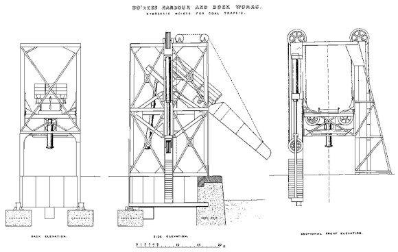 Three huge hydraulic hoists or tips were erected – two on the east wall of the wet dock and one on the north. These low-level hoists were specifically designed so as not to occupy large areas, allowing the quays also to be used for general goods. The large chutes were carried on six steel-wire ropes attached to two hydraulic presses. These took the coal wagons and tipped them end on. The chute or cradle and the wagon weighed about 10 tons and the coal could add up to 12 tons. The railway ran directly to the cradles of the hoists at the east end of the dock; the other hoist required a turntable. However, as the wagons only opened at one end and could, and often did, arrive facing the wrong way, turntables and capstans were provided at all of the hoists. One of the turntables was worked with hydraulics and here four men could ship 20-30 wagons an hour. Each hoist was provided with 1,500 yards of railway sidings so that the loaded coal wagons could be waiting for the ship to arrive.