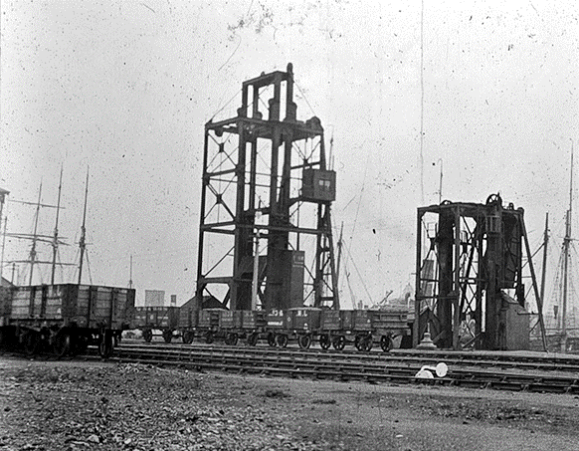 By 1910 there were four coal hoists, three of which had recently been replaced by Tannett, Walker & Co Ltd of Leeds. No. 1, situated on the north side, was the newest and largest, with a lifting capacity of 35 tons; Nos. 3 and 4, on the east side, each had a capacity of 30 tons. To overcome complaints of short weight of coals delivered at foreign ports, weighing machines were provided at the coal hoists in 1909; previously they had relied upon the weight marked on each wagon. There were six portable hydraulic cranes in 1881 for discharging purposes, and this had increased to sixteen by 1912. Twelve were at the Dock and four at the west pier of the Harbour. Six were erected in 1912 by Tannett, Walker & Co Ltd. One of the cranes had a capacity of 2 tons, another of 3 tons, whilst the average capacity of the other 14 cranes was 30 cwts. On the dockside the railway trucks were moved using hydraulic capstans, which were also used to assist vessels entering or leaving the dock.
