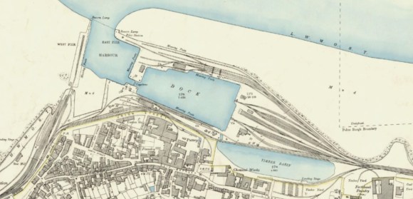 After the official opening of the dock the work on the pier extensions was completed and the timber pond was formed. In August 1882 the construction plant was sold off in consequence of the winding up of the estate of T.S. Hunter, the contractor. The timber pond opened off the south-east corner of the new dock and stretched eastward along the old coastline. The channel between it and the dock passed under two railway bridges which were quite close together. One day in September 1891 a large raft which was being taken to the timber basin became fouled underneath the bridges., Before it could be cleared the tide had risen and jammed the raft so that it could not be moved. As the tide rose higher, the bridges were in danger of being lifted from their foundations. The stone work of one of them cracked, and began to give way, and in order to prevent further damage two engines were procured, which stood on the bridges for several hours, blocking the rail traffic till the tide began to ebb (Dundee Evening Telegraph 21 September 1891, 2).