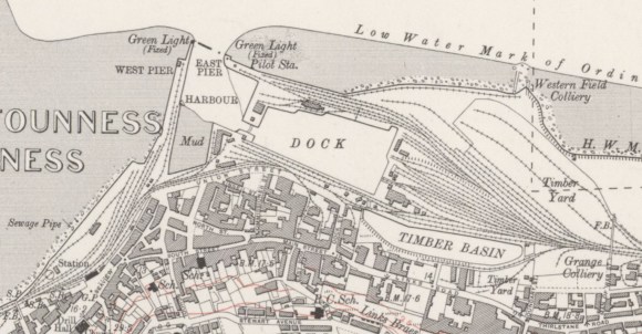 The landward portion was required for the railway sidings and the bit on the coast was for the sinking of a pit shaft; the Main Coal was reached in April 1913. On the Ordnance Survey maps it appears as the “Western Field Colliery” but everyone in Bo’ness knew it simply as the “Dock Pit.”