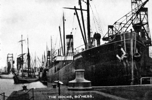The First World War seemed to creep up unnoticed on the traders at Bo’ness with startling speed. In August the movement of pitwood was severely curtailed as ships found it harder and harder to get insurance. A German schooner at Bridgeness was caught by surprise by the outbreak of war and was seized and towed to Bo’ness dock to sail under a British flag. Then, on 25 November disaster – the port was closed by the Government. The pilots assisted in taking away the twenty steamers lying in the roads and disembarked at May Island, where they were to be stationed for the duration. No more ships were to use the dock for four years, except the odd one requiring bunker coal – and then only in exceptional circumstances, such as the secrecy surrounding Q-ships. All goods – in or out – had to go to Leith or Granton by rail. Dockers, hoist drivers, crane operators, stevedores and all the other associated tradesmen were either transported daily to the ports further east, or left for good. Shops suffered.