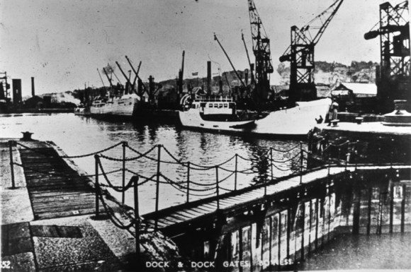 Late on the evening of 24 June 1959 a large crowd turned out to see the departure of the last ship from the dock. Appropriately, she was a Dutch vessel, the Monadisch of Groningen, and was gaily beflagged from stem to stern. After a 19 month campaign to keep it open, Bo’ness Dock officially closed on 30 June 1959. The permanent dock staff of 15 men, together with 82 registered dockers, and a few railway workers were redeployed. The dockers were transferred to Grangemouth, though they remained as a separate section, meaning that the work preference was given to Grangemouth men. The Bo’ness men could therefore only rely on the national minimum guaranteed by the National Dock Labour Board – £6 12s a week. However, trade at Grangemouth soon increased and they became fully employed. The Bo’ness traders were given reduced rates in sending their goods to Grangemouth.