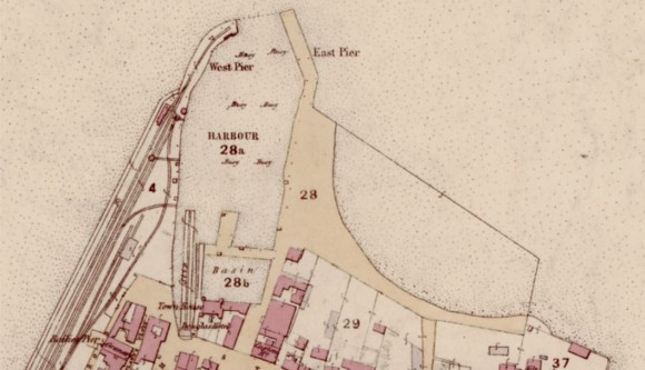 The slip was built in the westernmost section of the reservoir basin and projected into the landward end of the harbour. In order to reduce the gradient it was extended south into the grounds of the Town House (still called the coal fauld by the locals), the property of the Duke of Hamilton. It was held as the joint property of the subscribers. The rates for the use of the slip were to be fixed by a majority of them; one vote per shares of £25. The Harbour Trustees were to maintain the new basin wall on its east, and the harbourmaster was to take charge of the slip and collect the dues thereof. In consideration of all this, and of the money already expended towards the accommodation of the slip, one-half of the revenue arising from it, after deducting the rent of that part of the premises taken by the trustees from the Duke of Hamilton, was to form a part of the town’s funds (Salmon 1913, 260-1).
