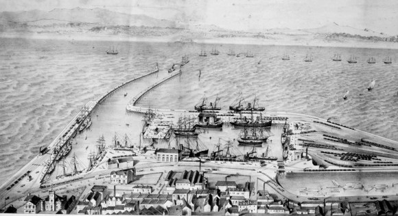 The removal of the Slip was part of a major new project to provide rail access to the East Pier and beyond. In order to get the lines to that area it was necessary to fill in the reservoir basin and the southern part of the Slip – allowing the northern half of the Slip to be returned to quayage. This required new embankments and the strengthening of existing walls. The proposal would take a great deal of traffic off the streets and the town’s surveyor, Mr Paul, prepared plans. Early in September 1869 Samuel Mason, general manager to the North British Railway Company, stated that the company was willing, at its own cost, to form the connecting lines between the Bo’ness station sidings on the one hand, and the east and central piers on the other hand, and to lay down turntables, provided that the Harbour Trustees renewed the quay wall on the eastern pier; extended the central pier so as to give additional berthage to two vessels; repaired substantially the eastern pier by the erection of a portion of new wall near the northern extremity of it; and made approachable the railway connection across the old Slip. The Company was to have the right to use the lines free of charge; to put down such cranes as it deemed necessary on the several piers; and to levy cranage dues at their discretion within a maximum of 6d per ton for steam cranes, and 3d per ton for manual power cranes. Much to the concern of the Harbour Trustees, the Railway Company also mooted extending the line to the harbour at Bridgeness. This was a private harbour belonging to the Cadell family, and as such was a rival. However, it was pointed out that it would also allow coal to be brought from Bridgeness to the harbour at Bo’ness (Falkirk Herald 4 September 1869, 2).