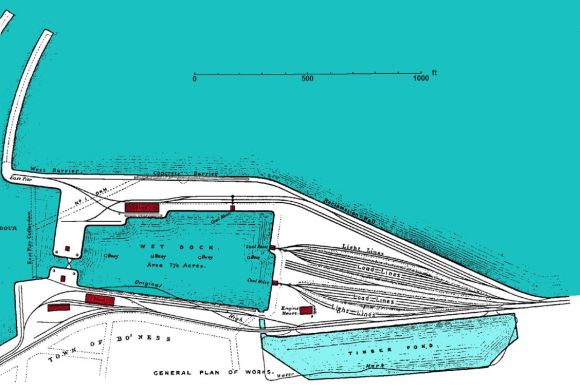 The old harbour now had an area of 5½ acres with quayage of 1,900ft. It was principally used for the accommodation of the large number of sailing vessels still used in connection with the timber trade.