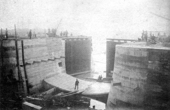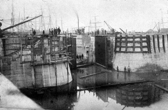 The harbour wall on the approach to the wet dock had to be more substantial because the clay foundation was not as good, and because it did not have the support of a constant head of water. No lock was provided at the entrance, as the single gates could be kept open for about three hours at high water. The entrance channel is 120ft long and its base– the sills and apron – was thicker than normal due to the soft nature of the ground. The sill is 13ft 6ins thick, being 5ft of granite invert, 2ft 6ins of brick in cement, and 6ft of concrete. Cross walls at either end of the apron were even deeper, reaching down 18ft 6ins, with 30ft long piles extending 20ft beyond them. The gates were made of greenheart wood and were worked by hydraulic presses with chains taken round rollers at their fast ends – it took 1½ minutes to open them. Sluices were built into the entrance walls and were opened and closed by four ship capstans.