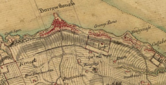 By that time Bo’ness was already a flourishing town and a mercat cross is mentioned there as early as 1573. This was one of the first areas surveyed by Timothy Pont in around 1575 for his map of Scotland and his surviving draft shows north at the bottom of the page. The great tower at Kinneil House is well illustrated with a coastal bay to its east, as are the sea-facing gables of the pan-houses at “Borrowstones.” These were then located at the Ness with a second shallow bay between them and Grange. One of the pans was discovered under Dymock’s Building during recent reconstruction work.