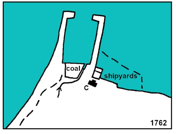Around 1733 a long pier was added 250 feet to the east of the first one to create a semi-enclosed harbour. Initially the new pier, which also provided additional wharfage, was about 386ft long and gave the complex the classic shape that was to endure for another 150 years or so (Graham 1971, 218).