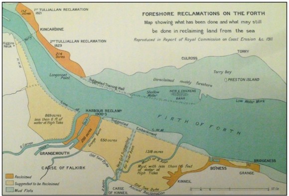Then in 1880 there was a scheme of reclamation put forward by Meik & Son coupled with a proposal to form a Conservancy. Still later there were suggestions submitted by Thomas Meik, civil engineer, Edinburgh, and Henry M Cadell of Grange, to the Royal Commission on Coast Erosion, appointed by the Government in 1910-11, for the reclamation of 2,000 acres by the formulation of a straight embankment more or less along the line of low water mark between Bo’ness and Grangemouth.