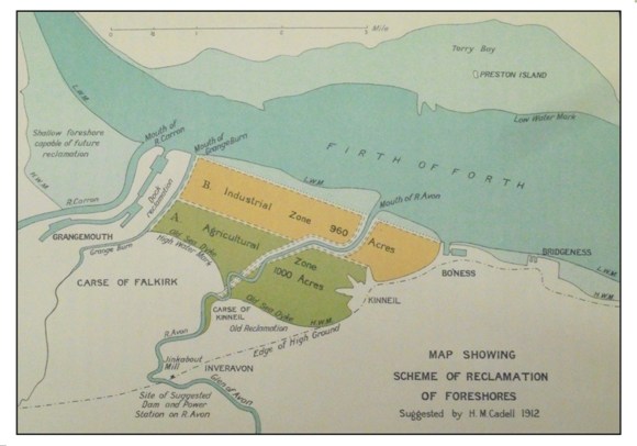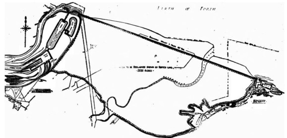 It is likely that the Dutch scheme mentioned by Sibbald was rejected due to the rival claims of the multitudinous riparian landowners, large and small, all of whom possessed various rights to the foreshore. Certainly, this was the case with later large-scale proposals. In 1875 Thomas Livingstone Learmonth of Parkhill, who then had a large fortune at his command, prepared a scheme to reclaim 3,600 acres of that foreshore from Grangemouth to Bo’ness, the cost of which was estimated at £275,000. Learmonth’s Bill was withdrawn from Parliament owing to the opposition of Lord Dunmore, Lord Zetland and others in the House of Lords. So he went to Denmark, where the terms offered were more favourable, and spent his fortune there reclaiming about 11,000 acres (Cadell 1912). H.M. Cadell, in his book on the Forth went over the plans and estimates and thought that, with some important modification as to the method of working, the greater part of the land, some 2,837 acres, might be reclaimed for less than half Learmonth’s estimate. He calculated that £100,000 would be sufficient giving a cost of £38 per acre. The estimate included £60,000 for the necessary embankments.