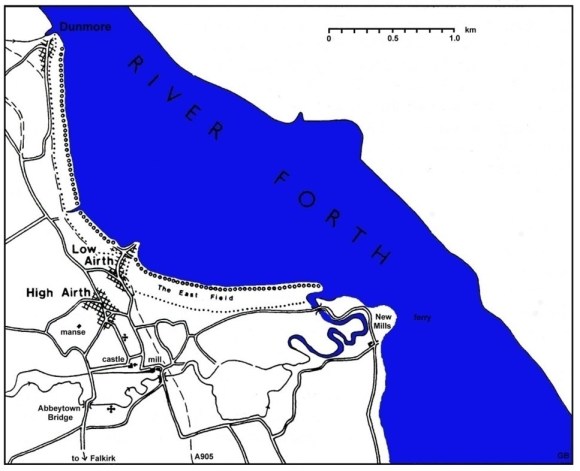 The broad bay between Elphinstone Pans (modern Dunmore) and Higgins’ Neuck provided a sheltered anchorage for ships and it is not surprising that the associated settlement at Airth became one of the first burghs in Scotland. Trade at the port must have been brisk and as a consequence the parish church in the 13th century was one of the most ornate. The harbour acted as the staple port for the royal burgh of Stirling and supporting infrastructure was put in place, such as yards for repairing and maintaining ships. At the centre of the bay there was a slight peninsula created as a result of sedimentation along the east side of the Airth Pow which issued across the mudflats at that point. This protruding spur was quite low but acted as a natural jetty. To reach it, the ships, which were relatively small and of shallow draft, had to follow the channel formed by the pow across the mudflats. As the incoming tide of the Forth was stronger than the outgoing one this channel had a tendency to veer to the north and it was a feudal obligation of the tenants in the area to dig it out when required – usually once a year.