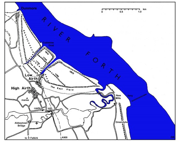 The bay with its extensive stretch of mudflats in shallow sheltered water was ideal for the reclamation of land. Just how early this began is uncertain but by 1689 a long narrow strip had been taken from the Forth along this entire stretch of coast. To the east of the Cobbletree Goat as far as the Pow Burn at Higgins’ Neuck this belonged to the owners of Airth Castle, and to the west to Dunmore estate. This meant that the cost was split, making the task more manageable. Initially this dual control was not a problem as the two estates progressed the work in tandem. By the time that they were out of step the understanding of sea dyke construction had advanced and so coordination was not as important.