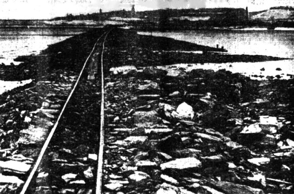 When the Slamannan and Bo’ness Railway was constructed in 1849-51 Wilson of Dundyvan gave permission to use the waste slag from the Kinneil Ironworks free of charge in the embankments which ran along the coast. With the permission of the Duke of Hamilton a short heavy embankment was run across the former bay to the west of the Snab. Another longer embankment was needed from Kinneil Brickworks to Bo’ness Harbour, but here the Railway Company potentially had problems over the rights of the public. This bay fronted the old part of the burgh and the feuars had free use of the foreshore for their boats. Small piers or jetties projecting into the water and the “beach” formed a natural playground for the children. One member of the public suggested that the railway should be set on a viaduct whose arches would leave access to the shore. The Town Trustees and the Harbour Trustees were alive to the benefit of having the railway and, after consultation with the Admiralty, agreed certain terms. These are summed up in the report by Thomas Stevenson, (father of Robert Louis Stevenson) C.E., Edinburgh, for the Admiralty: