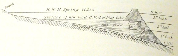 “The idea of a dyke of stakes and wattles did not commend itself to me, as there was available plenty of heavy rubbish from the colliery situated near low water at the east side of Bridgeness harbour, and with this the embankments were all constructed. At first a low bank, the top of which was only 3 to 4 feet above the level of the mud on the landward side, was run round the lower part of the foreshore when the tide was out. The bank was about 20 feet broad on the top, sufficiently wide for a double line of 3 feet light railway. It was not long before the calm water inside the inclosure became silted up with soft mud to the level of the rails on the bank. A second low embankment was run round the enclosure on the top of the first, so as to cause a higher stratum of water to lie calm behind it, and in time this too became smothered on the landward side under the rapidly accumulating silt. At the end of 1900, ten years from the date of the completion of the first bank, the mud had risen 10 feet above all the lower part of the enclosure, and the surface of the intake was well above the level of high water of neap tides and only submerged about 4 feet at ordinary springs.