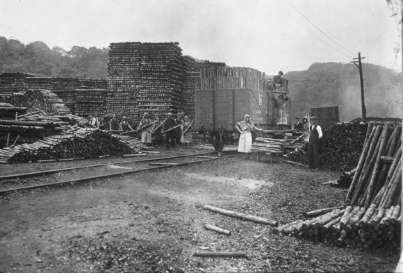 “Then we passed on to another woodyard where the dull, seasoned props contrasted with the tall stacks of railway sleepers at the railway company’s creosoting yard immediately alongside. Acres of land are given over to timber, props for the mining industry, and sleepers for the renewal of railroads. In the heart of this “Propolis” cutting operations were proceeding. Pit props were being handed down from a waggon to a circular saw operated by a petrol engine. As each bearer unloaded his prop, deftly ducking his head to do so, on a trestle, the prop was gripped by the saw men. It was poised for a moment before the whining, sharp-edged saw. Z-zzzzzzz! A high, tearing note as the steel severed the prop – just the kind of sound that would make a nervous or highly imaginative person retreat with relief. So the work went on, the halved props being loaded on to other wagons…”