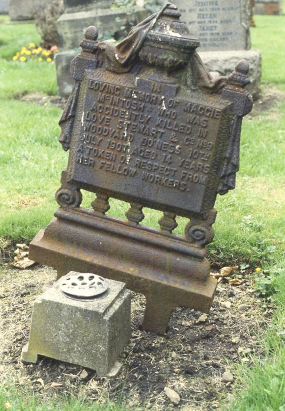 Pitwood yards were dangerous places. At the sawmill it was not uncommon for fingers to be lost. There were no wire cages or guards on the circular saws which revolved at high speeds. One incident in particular will be used to illustrate this point. In February 1908 Annie Queen was a vivacious nineteen year old outdoor worker at the Abergrange Sawmill in Grangemouth belonging to Abercrombie, Brisbane and Brown. She was engaged at one of the circular saws along with two young men cutting pit props, and her duty was to hand the cut pieces to a girl attending at a second saw. One of the pieces passing through her hands was covered with snow, which she formed into a snowball, with the intention of throwing it at the man attending the bench. The man, noticing this, concealed himself behind the bench to escape being struck. In order to get at him, the girl unfortunately placed her hand near the saw, and her hand came in contact with the blade, with the result that her hand was completely severed. It was found necessary to amputate the arm about three inches below the elbow (Falkirk Herald 29 February 1908, 5).