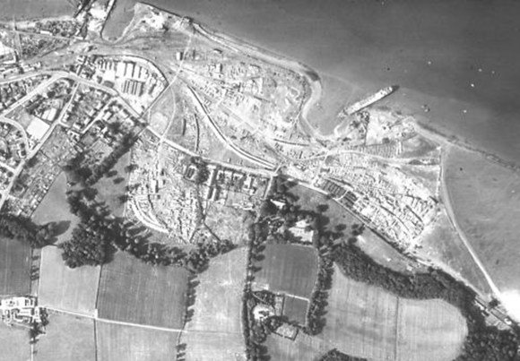 However, in high winds fire could spread rapidly, and that is just what happened at the same yard on Saturday 10 June 1950. The workmen left for the weekend at noon and shortly afterwards the watchman saw flames coming from the joinery shop door. The Bo’ness Fire Brigade were on the spot in about three minutes but, whipped up by a strong west wind, the flames spread among the sheds and stored timber. Further firefighting vehicles arrived from Edinburgh, Queensferry, Bathgate, Linlithgow, Broxburn, Uphall and Falkirk, till nearly a dozen units were in action. Miles of hose were run out (the Bo’ness brigade alone used more than two miles of it), and water was drawn from as far away as the foot of Harbour Road. But there still was not enough for the task, and it was not found possible to pump water from the Forth. Volunteers from the area saved a mobile crane as well as some power benches, and with hand extinguishers and buckets of water, helped to prevent the fire moving northwards through the stacks of pit props and logs.