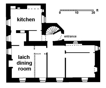 The south-west room appears in an inventory of furniture as the “Laigh Dineing-room.” Between it and the kitchen was a service room with a hatch into the kitchen. Here food would have been prepared for presentation at the table. This service room had a door leading out to the old garden on the west side of the house.