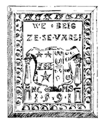Nicholas married Agnes Halkheid of Dysart in 1551 and the couple were given lands near Stow as a wedding present. These were subsequently exchanged for land at Over Dechmont, which was closer to Bonhard where they raised their family. After her death Nicholas married Mary, daughter of Sir Archibald Stewart of Castlemilk. Forty years after his first marriage he seems to have married a third time and it is this marriage which was commemorated in 1591 with an armorial panel on the doocot at Bonhard. This structure stood some 30 yards east of the House and was oblong with crow-stepped gables. The pitched roof rose to a central ridge and was pantiled down to the vertical boarding containing the entrances for the birds, below which it had five rows of slates. There were seven pigeon holes in the boarding, which gave the southern facing pitch a step. The doocot measured 17ft by 20ft 10ins and had a string-course approximately three-quarters of the way up the tall side walls. Inside there were 771 nests. A small entrance faced north. The coat-of-arms was set in the west gable facing the house with a simple rounded moulding around an inner border enriched with an egg and dart motif. At the top of the panel was the Cornwall motto “WE BEIG/ZE SE VARLE” (We build, ye see, warily). The shield was parted per pale and charged dexter: On a fess three mullets as many Cornish kaes or jackdaws, for Cornwall; and sinister: Quarterly, first and fourth, three crescents within a royal tressure, second and third, three garbs or three escutcheons, for Seton of Touch or of Abercorn. Below the shield were the initials N.C. for Nicholas Cornwall and M.S. for Marie Seton. This laird of Bonhard died in 1607, in his 70th year, and is interred in the family burial place at Linlithgow.