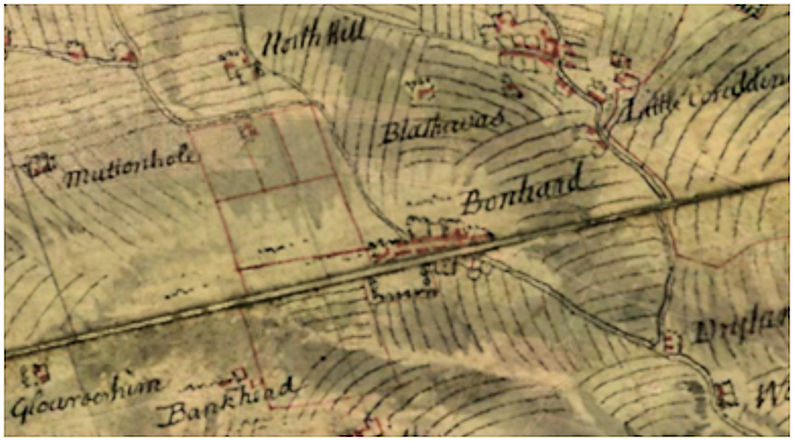 Roy’s map indicates large rectangular stone-walled enclosures to the west and north-west of Bonhard House which would have held extensive orchards and gardens at an earlier period. By 1755 there was also a small village just to the north of the house which presumably held the colliers associated with the local mines. This was a short-lived settlement and as the mines closed the occupants moved on and the buildings were demolished.