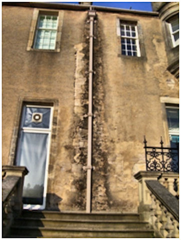 Externally the 1670s house was unusual for a Scottish mansion. The main north façade of the new wing was built in polished ashlar with a chamfered plinth course, moulded string courses and a cornice, presumably capped by a plain parapet. The window margins here were beautifully finished in roll-and-double-fillet mouldings. Lozenge-shaped mason’s marks occur on the wall. The windows on the ground floor are large, especially when compared to those usually found at this level. Those on the floor above were even bigger. When David Crawford had a house built in Hamilton, by the well-known architect James Smith, it was said to be