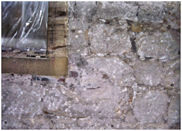 Illus 18: Mid 17th Century Plasterwork covered on the right by later lathe and plaster and cut on the left by new brickwork required to insert a concrete lintel over a doorway.