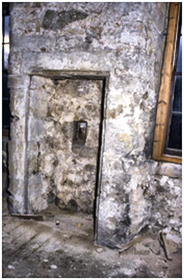 The first-floor windows with roll and hollow mouldings were quite large and caught the light from the south. This floor probably included private accommodation for the family leaving the hall in the old tower to continue in its public role. A short narrow vent towards the west end of the extension indicated the position of a mural chamber which served as a latrine. As the walls were much reduced in thickness it was not practicable to construct garderobe shafts in their straight lengths, though one can be found in the north-east corner where it utilised the greater bulk of stonework at the junction of the north and east walls (this shaft is now used for services cables and pipes). On the second floor immediately above this vent another mural chamber was observed from inside. As can be seen from the photograph these were little more than broom cupboards with rebated margins so that the door would fit snugly. That was useful for two reasons – first because it excluded the smells from the room; and secondly because it gave greater privacy to the user. The vent was required because now these chambers held wooden buckets placed under seats to contain the dung. Not only could these give off unsavoury odours but if allowed to fester they, like the earlier garderobes, produced methane gas. Dried moss would have been used as wipes and also placed in the bucket.