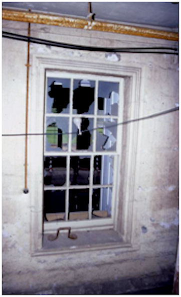 Illus 19: Roll-and-Fillet Mouldings on one of the north façade windows with chamfered plinth course – 1990 before restoration work.
