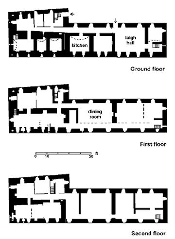 Pont, on his map of c1570, shows the tower house as being six storeys high with larger windows on the upper storey capped by a corbelled parapet with corner bartizans. This suggests that we have lost the upper two floors as well as the battlements. There is no surviving evidence for the internal stair to these upper floors but logic suggests that it was placed within the thickness of the walls near one of the corners and that on the south-east would have been most suitable. The great thickness of the walls may therefore have been due to the great height.