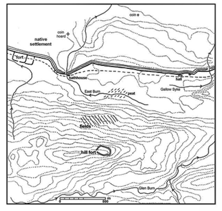 The morphology of the hill fort suggests that it was constructed in the early Iron Age, though it may have been occupied for centuries. By the time of the Roman invasion in the second century AD the centre of power seems to have shifted to a small hill fort on Wormit Hill at the east end of the town of Falkirk. The construction of the Roman frontier system through the northern part of the Callendar policy disrupted the existing infrastructure and upon the Roman abandonment of Scotland the line of the Antonine Wall became the main cross-country route. The find of a piece of samian behind the Wall on Palace Hill to the north-east of Callendar House might suggest that it became the locus of a local leader at this time. The site lay on a prominent W/E glacial esker and was ideal. To the north was the remnant of the Roman wall; to the south the valley of the Gallow Syke which curved round and protected it on the east. It dominated the main road which here occupied the upcast mound of the earlier frontier. It is perhaps significant that the Roman wall gave its name to the large tract of land between the rivers Carron and Avon – Calatria – derived from the Gaelic for fence (Reid 1991). Just as important is the use of the derivative name “Callendar” for the section of the Wall east of Falkirk.
