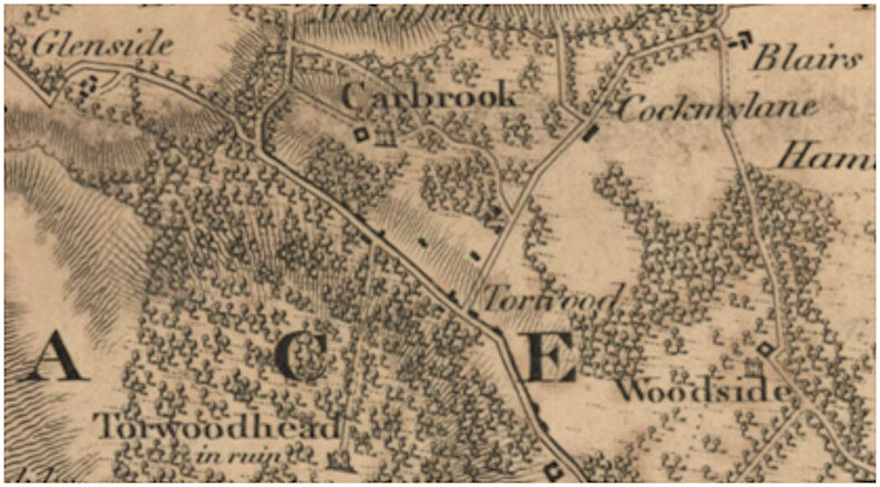 Carbrook House and estate, in the parish of Dunipace, were located at the very edge of the Falkirk district a little to the north of Torwood near Plean. For many centuries the land upon which it stood formed part of Torwood. John Reid points out that all of the evidence suggests that the lands that were originally known as Carbrook lay on the north side of the Tor Pow in St Ninians Parish prior to the 18th century. In 1794 Carbrook was sold to John Campbell, Writer to the Signet, along with the lands of Hollings and Darnbog and the name was transferred to the south side of the Pow. A sasine of 1810 gives “Carsbrooke or Corsebruike now called Carbrook.”