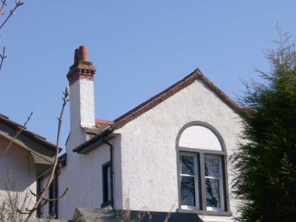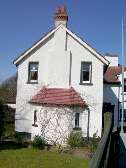 The House occupies a slight hill slope from south to north and its main façade, containing the larger windows, faced WSW. The long wooded drive branched southward from the main road a little to the east of the “Westquarter Gates” and then swung round to the west to approach the house from the south-east. Here the two jambs of the building met and there was a moulded doorway in the re-entrant angle along with a dormer window which breaks through the eaves. The building is two-storey in height with white rendered brick walls, red rosemary tile roofs (now replaced with green slate), a knee height brick plinth, and brick margins to the voids (the brickwork now painted black) . The south gable displayed a symmetrical arrangement of features with a prominent external central chimney breast. This threads through the eaves barging to terminated in a cap of red brick with alternate layers set at different angles. Below the eaves the chimney breast is stepped and at the ground floor splays outward to contain an inglenook with small vertical windows in the chamfered sides. These are neatly reflected by large windows on the first floor.
