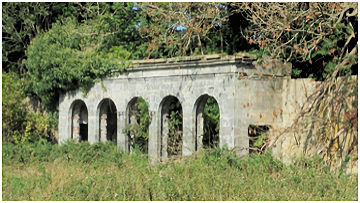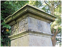 An ornate stone summerhouse/conservatory was built against the centre of the north wall of the walled garden. It is 35ft long and projects 8ft 4in from the wall. Its front consists of an arcade of five round-headed arches, the central one of which formerly housed a panelled door with a glazed fanlight while the others were fitted as large windows. The arcade is of ashlar, 2ft thick, and the rest of the walling is of brickwork, 1ft 4in thick. The archways are 4ft 9in wide and are separated by piers 1ft 8in wide. The arcade carries an entablature comprising a moulded architrave, plain frieze, moulded cornice and low blocking-course. The keystone of the doorway is carved with a five-petalled floral ornament.