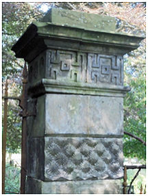 Ogilive may have considered reopening the north avenue from Carronshore. He had a grand triple gateway placed across its line immediately north of the quadrangle. From the north-west corner of that building a stone wall enclosed an outer court, and beyond that it was continued as a garden wall of brick curving to the north-east to form the north side of a small orchard and a walled garden. The previous entrance appears to have been at the junction of the stone and brick walls and would have given access to the brewery. This was blocked up and a new opening made c20m to the north. The gate has a central vehicular entrance with pedestrian ports to either side. The central opening is 10ft 3in wide and the lateral ones 3ft 4in. The piers are square, the inner ones showing alternating bands of ashlar and rusticated work with shell-ornament, while the outer ones are plain except for moulded arrises. All are capped by a moulded cornice above a frieze and necking, the friezes being decorated with a fret pattern or floral devices.