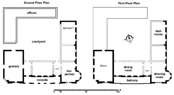 The buildings were arranged around a central courtyard measuring approximately 67ft square. The dwelling occupied the whole of the east wing and most of the south wing. At the junction of the two was a tall two-storey block which extended 11ft beyond the south front. It was matched by a block on the south-west corner which carried similar architectural motifs but which served as a warehouse and was known as “the granary.” This block was wider than the domestic wings but extended north for less than half of the west wing before it narrowed and stepped down to be continued as a less well-built structure. At this point a pend or transe led into the courtyard. The north wing was also low in height and was made of brick. These lower ranges were intended for use in the shipping trade. Altogether the buildings measured 108ft 6in from west to east by 120ft from south to north. The main elements of the south and east wings were about 26ft in breadth. The main walls are generally 2ft to 2ft 3in thick.