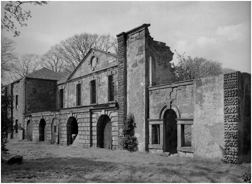 There were other estate roads. The road that led to the doocot and offices then curved to the north where it lay on the old river course. A stubbly stone wall followed the curves of the old river bank with a ditch between it and the road forming a ha-ha. At the northern end of the extinct river loop the road continued in a north-easterly direction to Back Row which was used as a home farm. From there the road ran to a junction with the main road north from Kerse Bridge to Airth opposite to Newton Avenue. Here the East Lodge controlled access and over the following decades the small village of Skinflats developed around it.