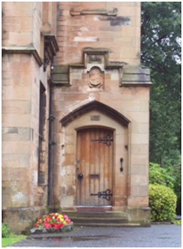 The south face has an advance gable as its west segment with a square bay window set within it sporting a garter inscribed “PAX.HVIC.DOMVI”; and an angled ground floor bay window below two dormer windows in its eastern segment. The east face, which overlooks the valley of the West Burn, has three gables. The central gable is advanced and contains the ornate doorway in its southern re-entrant. The southern gabled segment has a corbelled oriel window; whilst the northern one has a narrow square two-storey bay window. The heavily iron bracketed door sits within a simple low arch with “MDCCCLII” in relief above it and framed by a deeply moulded Gothic arch. Above this is an eroded coat-of-arms with a surviving mullet and a banner bearing the inscription “LAUDO MANENTEM.”