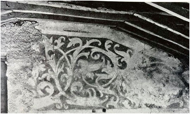 During the 1926 visit of the RCAHMS to Kinneil House a photograph was taken of excellent 16th century work in red distemper similar to that of the dado in the Arbour Room. It decorated the upper part of the west wall of the south room on the second floor, but was destroyed when the building was dismantled in 1936. This floor would have been occupied by the lady of the house, Margaret Douglas, and the arrangements would probably have mirrored those of the Duke of Chatelherault on the floor below. The photograph shows the squared and pegged roof timbers which are of small section but closely spaced, suggesting that they were probably used for fixing a painted timber ceiling. If so it was a high ceiling commensurate with the great status of the occupant.