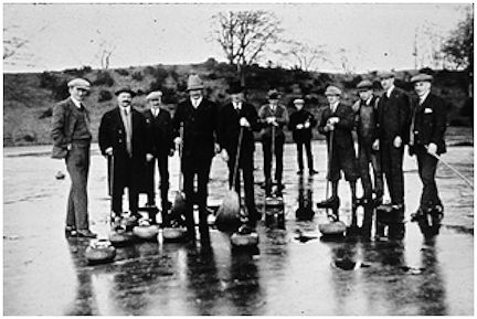 Illus 4: The Leslie Park Curling Club on their home pond, c1925.