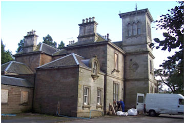 The house was substantial (SMR 574; NS 8796 7995). It was designed in the Italianate style then much in favour and consists of a large square two-storey block with a projecting tower and arcaded loggia facing the main drive to the west and an articulated façade overlooking the terraces to the south. The articulation includes a ground floor chamfered bay window (west) and an advanced bay (east) having a square bay window on the ground floor surmounted by a narrower framed window capped with a segmental keystoned pediment at the wallhead. These features are all unified by prominent moulded string and eaves courses, as well as the use of stugged coursers and quoin angles. The porch is placed in the bottom of the tower and is entered via the loggia and has a cavetto-splayed doorpiece. The slim three-storey staged tower resembles the Steeple in Falkirk with an arched traceried window at the lowest level, a plain bordered rectangular window with bracketed sill on the first floor and three slit windows in each of the four sides in the observation room to resemble a belfry. It is capped by a low pyramidal roof with wide eaves. A blank roundel decorates the first floor on the north and south sides.
