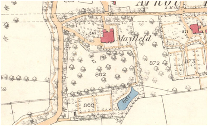 1864, summer: “Just to see how the grounds were looking this season, both as regards present appearances, and future prospects, we dropped in upon them the other evening, and had our eyes feasted with an even more than former display of verdure and bloom. But in this glorious month of May, the fairest and rarest of Flora’s family must, of course, be seen at the best advantage. At present, the Mayfield property is in beautiful condition. The feet tread on a deep green sward, with a pile like the softest velvet, while everywhere the eye is dazzled with the gay robes with which trees and shrubs are alike adorned. The weeping Gean, with its gracefully drooping foliage and snow-white blossom, vies with its neighbour the double cherry of not less sweetness and purity; whilst both are totally eclipsed by the gorgeous rhododendrons and flaunting tulips of the surrounding slopes and parterres. Across the upper lawn are also a great variety of splendid plants, and rare, too, as magnificent. We shall content ourselves by merely particularising a few of the more notable. First of all, there is the cupresses nutkaensis (thuiopsis borealis), now thoroughly clad with ripe seed, and this, we believe, is the first time that the same plant has been known to fruit in Britain. It stands eight feet high, and is alike admirable in conical form and closeness of foliage. Then we have other specimens of the pine, including the retinispora obtuse, the sciadopitys verticillata (umbrella pine) the thuiopsis dolobrata, the cupressus Lawsoniana, the picea nobilis, & c. Nor can we omit other two particular specimens of their class: the Saxe-Gothea conspicua (Prince Albert Yew), which at present shows a load of both male and female blooms. The plant, in all respects, is exceedingly well-grown, and measure about six feet in height. The other – a really pretty little bush – is the euonymus aureis sureis variegate. Within the hot-houses, however, are the most valuable, and, in some instances at least, the most lovely of the flowers and shrubs. Let us note the dendrobium densiflorum, the dendrobium Dalhousianum, the saxifrage from Japan, the yucca quadricolor, the dracaena cordyline indivisa, the clematis fortune and Standishi, the lastrea Standishi, the lilium Thundbergianum, the thuiopsis Standishi, & c. Mr Russel has also under glass 20 bulbs of the lilium auratum, together with an infinite variety of geraniums, Japanese honey-suckles, and fuschias. The Mayfield grounds are likewise about to be further adorned, artificially, by the erection of a water fountain, while the pond itself is to be laid immediately with metal, so that the water may at all times be perfectly clear.”
